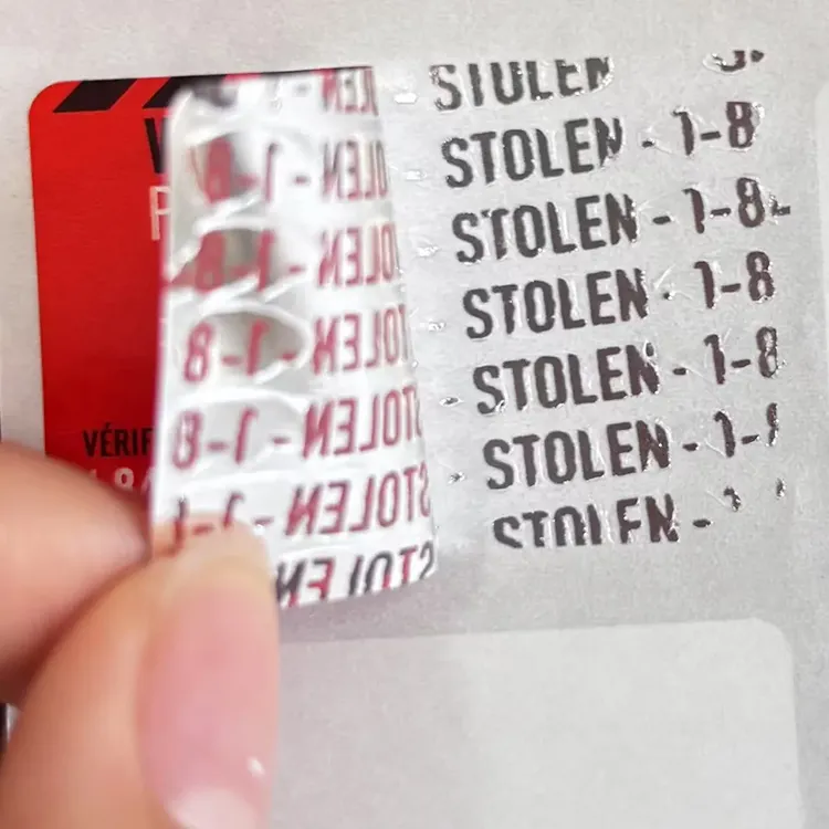 3. از برچسب ضد جعلی از پشت پرده پرده برداشته شدههمچنین این یک برچسب ضد تشییع کننده یک بار است. هنگامی که برچسب باز شد , یک الگوی یا متن خاص روی لایه پایین باقی می ماند - نشان می دهد که برچسب باز شده است و از استفاده مجدد از آن جلوگیری می کند - اضافه کردن یک لایه اضافی از امنیت برای محصول. به عنوان مثال , پس از باز شدن , ممکن است کلمات "باز شده" یا الگوی خاص برند را نشان دهد.