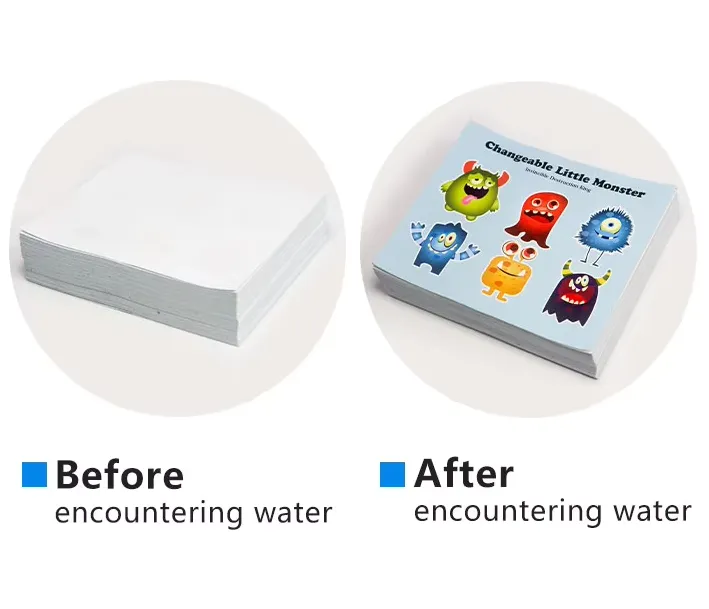 هنگامی که در آب غوطه ور می شود، بلافاصله به حالت خمیری تبدیل می شود و به سرعت پراکنده می شود. سپس رنگ های چاپ شده روی آن پخش می شوند و بر اساس آن تغییر شکل می دهند. فرآیند تغییر رنگ برگشت ناپذیر است. پس از قرار گرفتن در معرض آب، به طور دائم رنگ را نشان می دهد.
