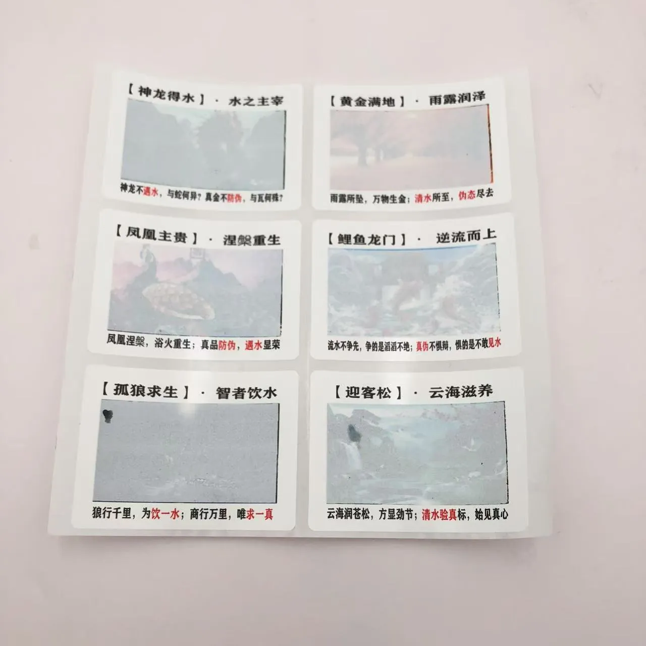 برچسبهای حساس به آب به تغییر رنگ از واکنشهای فیزیکی یا شیمیایی بین جوهر و آب استفاده میکنند تا الگوهای پنهان را قابل مشاهده کنند یا باعث تغییرات رنگ شوند. این برچسب ها که با فرآیندها و تجهیزات تخصصی تولید می شوند، ویژگی های عالی ضد جعل را ارائه می دهند. پس از خشک شدن، انواع خاصی می توانند به حالت اولیه خود برگردند و امکان استفاده مکرر را فراهم کنند.