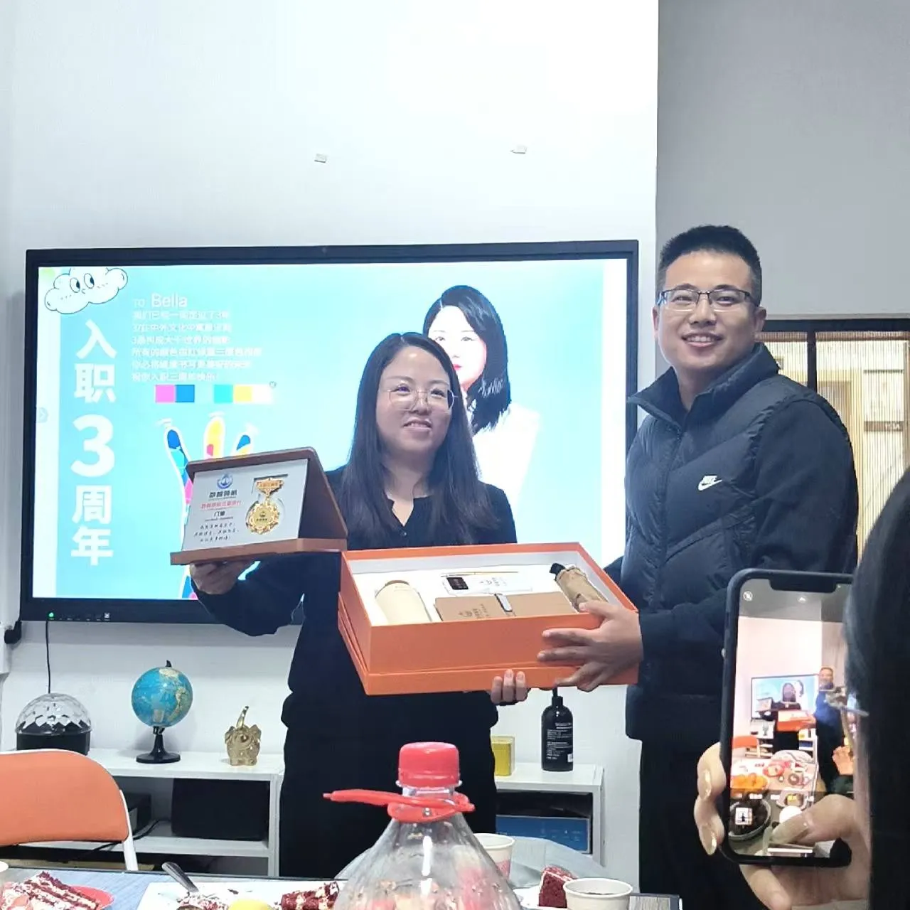 به عنوان یک سورپرایز فوق العاده، رئیس گائو شخصاً هدایای سالگرد کار زیبایی را به تام و الا و مدیر بلا اهدا کرد. این توکنهای ویژه قدردانی صادقانه از مشارکتهای آنها در سالهای گذشته است و بهترین آرزوهای ما را برای رشد مداوم آنها با شرکت دارد.