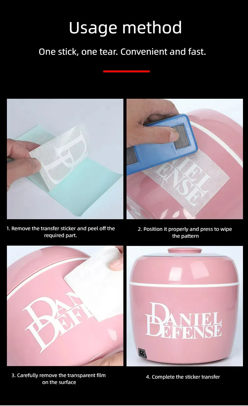 1. سطح چسب را تمیز کرده و اطمینان حاصل کنید که هیچ لکه ای وجود ندارد. کاغذ پشتیبان برچسب انتقال را برداشته و برچسب را با فیلم انتقال به موقعیت هدف وصل کنید. برای سطح و حذف حباب های هوا از یک اسکرابر استفاده کنید و در آخر فیلم انتقال را پاره کنید.